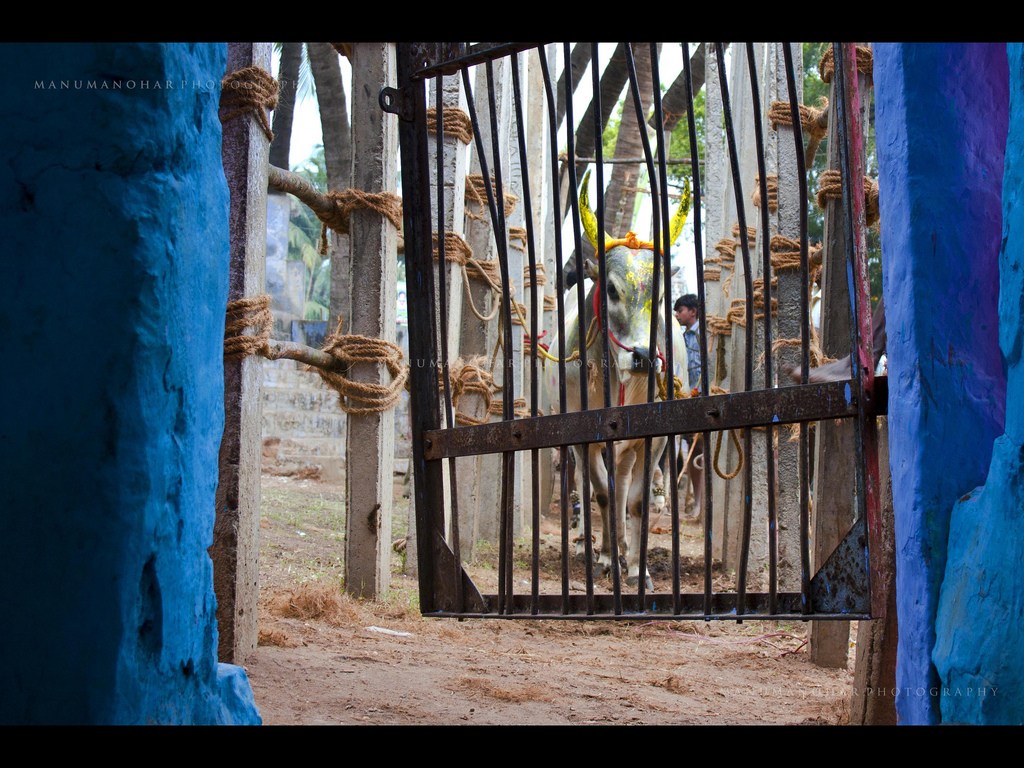 Bulls are brought to the arena the previous day and tied in coconut groves around the village. Fodder is brought along and water is provided by the host villagers. Sometimes fodder is also provided. A team of veterinarians, animal welfare officials inspect the bulls and give a medical certificate. Before the event starts, they are lined up in batches of 15 close to the rear side of the vaadi vaasal.